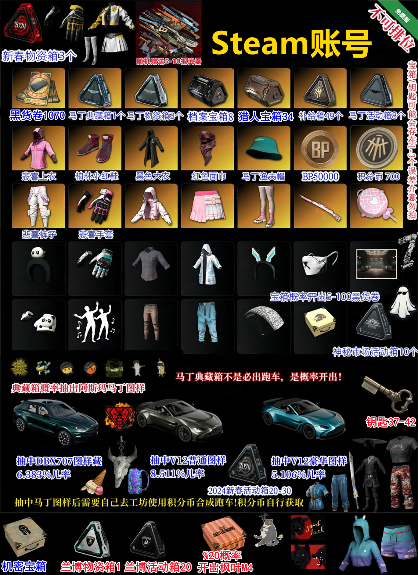 PUBG游戏Steam皮肤账号(不!是!CDK!版!本!)。宝箱/钥匙可能存在1-3个的误差,介意勿拍!!!!