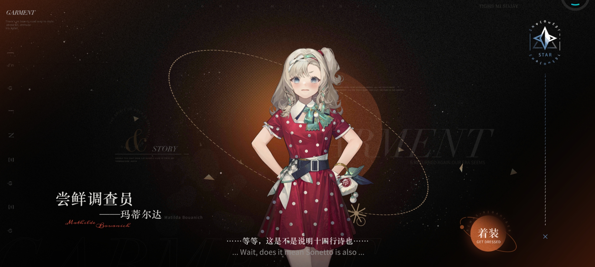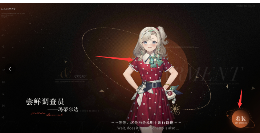 皮肤服饰:玛蒂尔达联动衣着服饰「尝鲜调査员」(服饰如图所示)