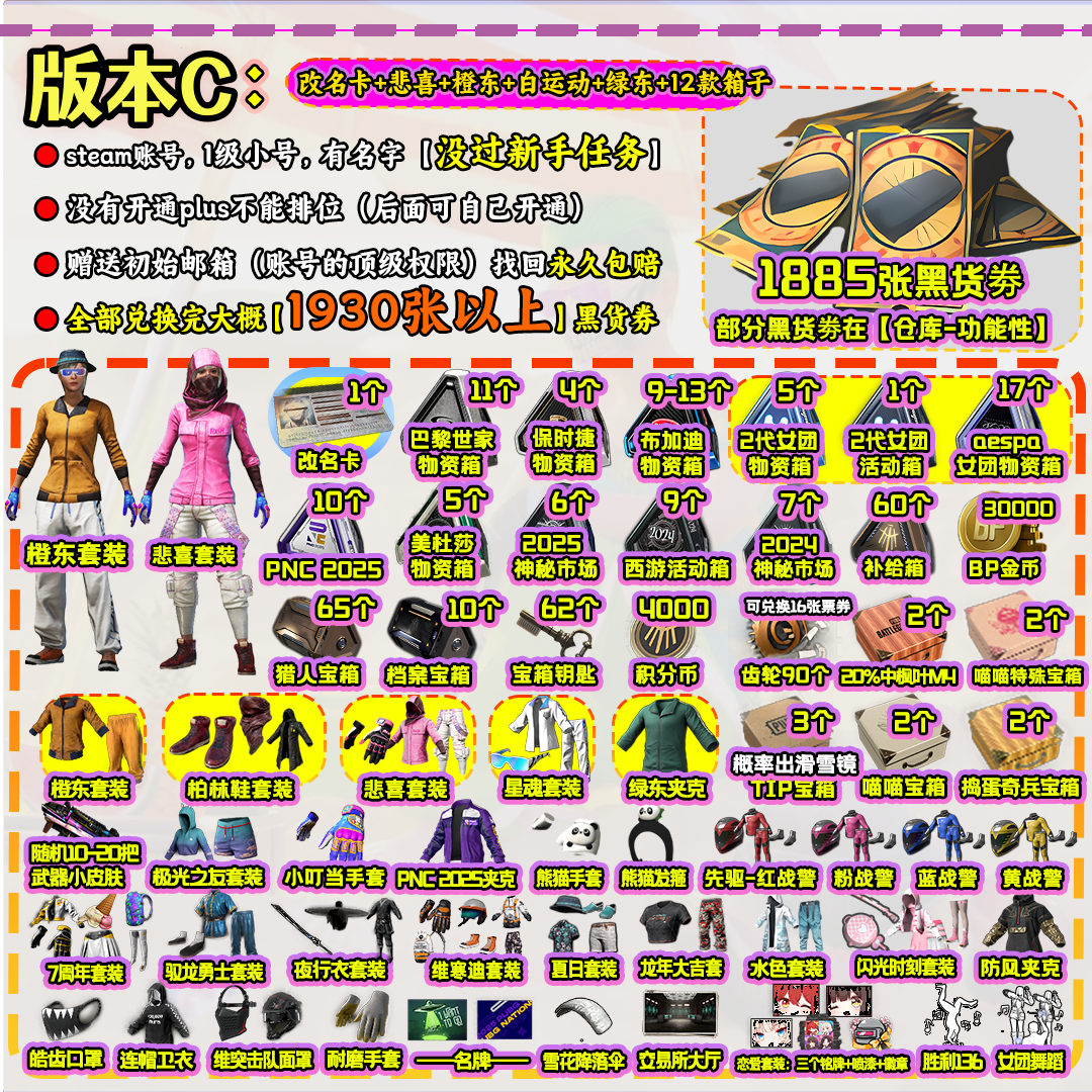 商品版本:该账号一共分为13个版本,包含PUBG Steam账号A号,PUBG Steam账号B号,PUBG Steam账号C号、PUBG Steam账号D号、PUBG Steam账号E号、PUBG Steam账号F号、PUBG Steam账号G号、PUBG Steam账号H号、PUBG Steam账号J号、PUBG Steam账号K号、PUBG Steam账号L号、PUBG Steam账号M号、PUBG Steam账号O号