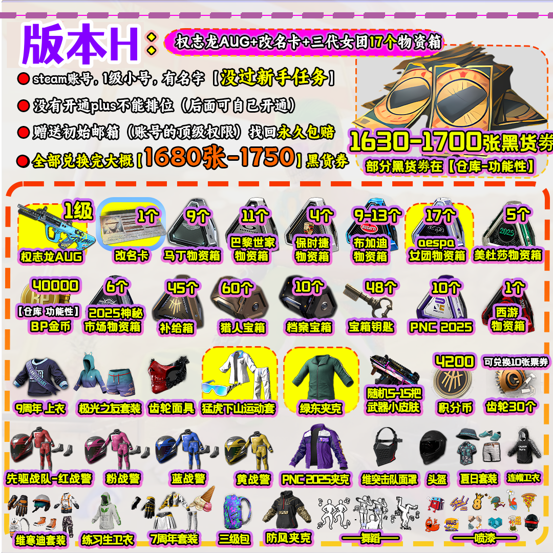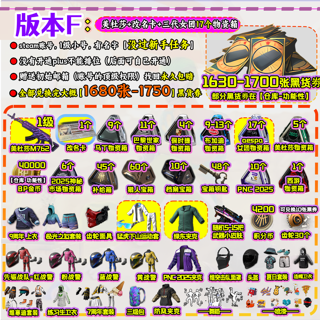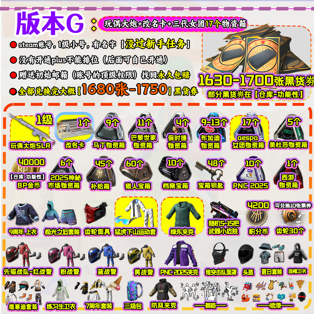 商品版本:该账号一共分为13个版本,包含PUBG Steam账号A号,PUBG Steam账号B号,PUBG Steam账号C号、PUBG Steam账号D号、PUBG Steam账号E号、PUBG Steam账号F号、PUBG Steam账号G号、PUBG Steam账号H号、PUBG Steam账号J号、PUBG Steam账号K号、PUBG Steam账号L号PUBG Steam账号M号PUBG Steam账号O号