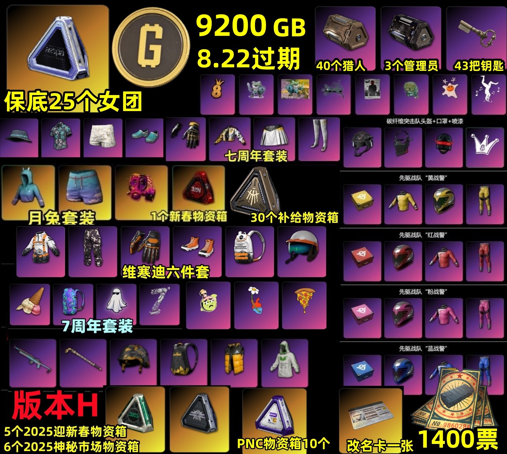 商品版本:该账号一共分为3个版本,包含PUBG Steam账号(内含1400票+25个女团物资+5400G)、PUBG Steam账号(内含1400票+25个女团物资+7200G)、PUBG Steam账号(内含1400票+25个女团物资+9200G)
